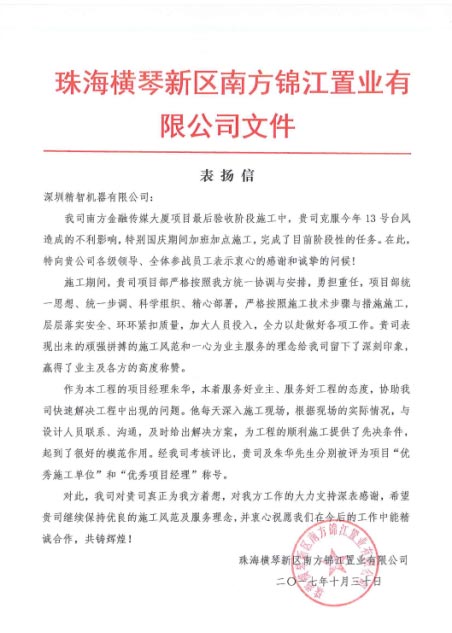 客戶單位在項(xiàng)目完成之際發(fā)來(lái)表?yè)P(yáng)信,既是對(duì)項(xiàng)目組的工作肯定,也是對(duì)精智的肯定,同時(shí)也是精智機(jī)器全體同仁實(shí)現(xiàn)“精湛技術(shù),智能卓越”的企業(yè)理念的驅(qū)動(dòng)力! 在以后的項(xiàng)目施工過程中以此為例,謙虛謹(jǐn)慎,細(xì)致認(rèn)真,精益求精,成就客戶成就自我,為公司和客戶贏得更多的聲譽(yù)和佳績(jī)!